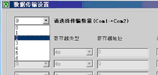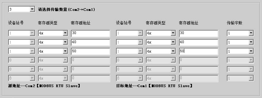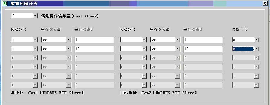 第二步:根據需要選擇COM1->COM2數據傳輸數量(讀取Com1設備的寄存器,寫入Com2設備)