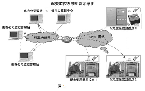 ⑴ 配變管理主站; ⑵ 配變監控終端(配電綜合測控儀); ⑶ GPRS通訊通道。