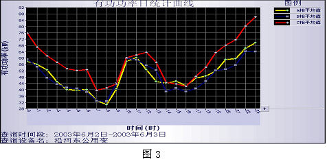 配變監控管理係統可以針對某一台區、配變線路或某配變自動生成日報表、月報表、年度報表等彙總報表及。日報表統計一天24小時定時存儲的運行參數,累計停電時間、過壓、過流報警,無功補償投切控製等情況;報表可直接進行預覽、打印。自動生成趨勢曲線,直觀的反映出各配變的運行趨勢。曲線可任意放大、縮小和拖動。曲線圖如圖3: