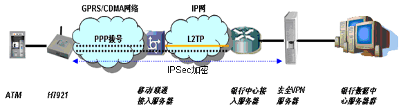 如上圖2所示為銀行終端利用現有GPRS&CDMA網絡VPN技術組網,GPRS網絡VPN技術叫“專用APN(接入點名稱Access Point Name)”,CDMA網絡VPN技術叫“VPDN(虛擬拔號專用網Virtual Private Dialup Network)”,無線網絡VPNjishushizaigonggongdewuxianwangluozhonggeiyonghufenpeiyigeziwang,yonghuzhinengzaizhegeziwangneijinxingtongxun,yonghuwufakuayuechuzhegeziwang,bushizhegeziwangxiadeyonghuyewufakuayuejinzhegeziwang,xiangdangyuzaigonggongdewuxianwangluoshanggeiyonghujiashelegejuyuwang,zhiyouzaizhegejuyuwangneideyonghuzhijiancaikeyitongxun,suoyoushujujunyuInternet 隔離,大大增強了信息的安全性,這種方式下最終給用戶帶來了非常可靠的安全性,但組網費用高,另不能跨網組網。
