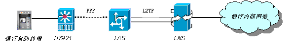 在上圖4中,銀行ATM自助終端通過目前的GPRS&CDMA無線網絡接入終端,實現網絡連接,移動/聯通等運營商提供了接入服務器LAC,通過無線終端設備向運營商接入服務器LAC發起PPP撥號,實現與銀行中心接入服務器LNS之間的L2TP隧道的建立,並將無線終端的PPP撥號轉向銀行接入服務器LNS,最終實現無線終端與LNS之間的PPP會話的建立,在銀行網絡核心,部署一台安全VPN服務器,接受來自無線網絡接入終端的IPSec會話請求,通過與ATM自助終端無線VPN終端之間建議IPSec隧道,實現相互之間數據傳輸的安全加密。