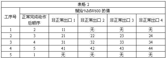 為實現上表中的動作控製,將動作的動作順序編號後放入PLC的某一內存字中,如%MW600,為wei便bian於yu理li解jie和he記ji憶yi,各ge工gong序xu中zhong的de非fei正zheng常chang出chu口kou的de編bian號hao按an照zhao其qi出chu現xian的de工gong序xu按an規gui律lv另ling外wai編bian號hao,而er不bu使shi用yong與yu主zhu控kong工gong序xu連lian續xu的de編bian號hao,這zhe樣yang,以yi上shang動dong作zuo表biao可ke以yi分fen解jie成cheng以yi下xia兩liang張zhang表biao格ge。在zai這zhe裏li需xu要yao注zhu意yi的de是shi,%MW600中放的動作的編號,在程序中每一個編號代表的程序段應該是唯一的。 表格2