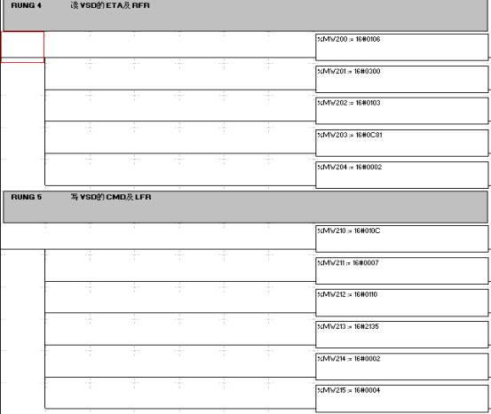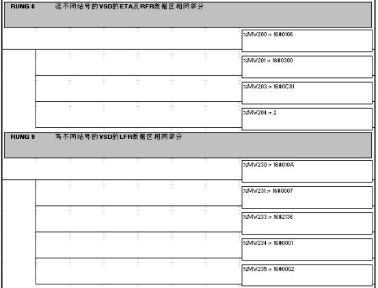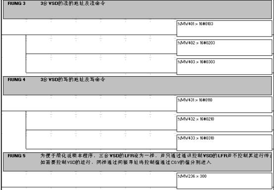 填tian寫xie通tong訊xun數shu據ju區qu中zhong每mei個ge子zi站zhan不bu相xiang同tong的de部bu分fen,這zhe部bu分fen數shu據ju必bi須xu存cun放fang兩liang個ge連lian續xu的de數shu據ju區qu中zhong,以yi使shi後hou麵mian的de數shu據ju取qu出chu程cheng序xu能neng使shi用yong間jian接jie尋xun址zhi的de方fang式shi,這zhe也ye是shi優you化hua程cheng序xu的de一yi個ge比bi較jiao關guan鍵jian之zhi處chu。 在這一例子程序中,將變頻器的輸出頻率值的控製簡化了,使3台變頻器的速度全部為30Hz,實際使用時,可能參考後麵的讀操作返回數據的保存方式,運用間接尋址方式編寫出相應的代碼: