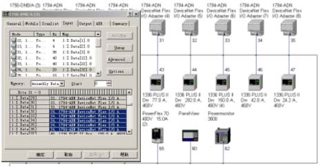 作為網絡掃描器的1756-DNB它最多可以容納63個節點,輸入輸出容量分別為124、123個雙字。在網絡配置中,每個1794-ADN占用1個輸入字;開關量模塊(1794-IB16和1794-OB16)分別占用1個輸入或輸出字;模擬量模塊(1794-IE8和1794-OE4)每通路占用1個輸入或輸出字;變頻器通過播碼或軟件設置為3個輸入和輸出雙字,這樣,處理器可從變頻器上最多采集包括頻率在內的5路參數,並且其中4路可通過人機界麵進行選擇切換並顯示。