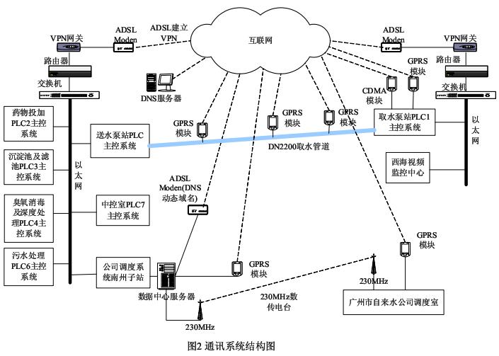 南洲廠區、取水站、公司調度室無線通訊采用廣州市自來水公司現有 230MHz 係統和電信GPRS/ GSM 方式,在三地間通過電信 ADSL 專線,進行數據傳送;有線與無線互為備用,自動切換,正常以有線為主。通訊係統結構見圖 2 所示。
