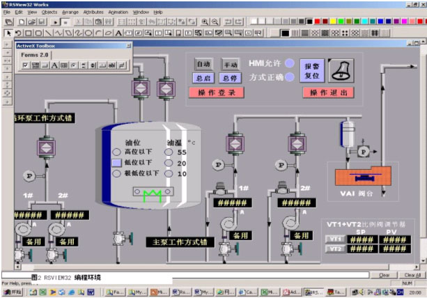 評(ping)判(pan)一(yi)個(ge)可(ke)視(shi)化(hua)平(ping)台(tai)的(de)性(xing)能(neng)時(shi)不(bu)能(neng)閉(bi)而(er)不(bu)談(tan)其(qi)是(shi)否(fou)易(yi)學(xue)易(yi)用(yong)。這(zhe)對(dui)自(zi)動(dong)化(hua)應(ying)用(yong)人(ren)員(yuan)尤(you)其(qi)重(zhong)要(yao)。一(yi)個(ge)優(you)秀(xiu)的(de)平(ping)台(tai)應(ying)能(neng)使(shi)編(bian)程(cheng)者(zhe)盡(jin)快(kuai)上(shang)手(shou),迅(xun)速(su)掌(zhang)握(wo),而(er)不(bu)是(shi)花(hua)很(hen)多(duo)時(shi)間(jian)去(qu)培(pei)訓(xun)或(huo)自(zi)學(xue)。在(zai)這(zhe)個(ge)可(ke)視(shi)化(hua)平(ping)台(tai)之(zhi)上(shang),他(ta)(她)根據以往的工作經驗和閱曆,把更多時間和精力置於應用程序的設計和二次開發上。RSView32係統編程概念和開發環境簡單易懂,便於自學。結合學習隨RSView32係統安裝盤一道提供的Samples程序,可解決諸如標簽定義、繪圖、動畫處理、趨勢顯示以及報警/事件記錄等一般畫麵應用問題。圖2為RSView32係統編輯窗口。