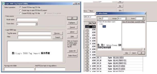 如果ControlNet網絡已經開通,則通過掃描連接OPC Server 的Node(在本項目中就是PLC),可直接對標簽變量的地址賦值。通過這種方式連接地址,實際上已經將程序調試中與PLC之間的對點工作近乎完成。圖4為標簽地址在線連接的操作過程。