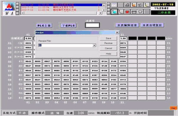 二er次ci冷leng卻que水shui表biao是shi連lian鑄zhu過guo程cheng重zhong要yao的de工gong藝yi參can數shu。二er冷leng水shui表biao為wei各ge扇shan形xing段duan的de冷leng卻que水shui調tiao節jie回hui路lu提ti供gong設she定ding值zhi,是shi多duo組zu常chang數shu的de集ji合he。使shi用yong時shi一yi般ban根gen據ju不bu同tong的de鋼gang種zhong,在zaiRSView32係統環境內從畫麵PC機的硬盤中將對應的水表調至內存並在畫麵上顯示,必要時予以修改後再下裝至PLC。修改後的水表還要存回硬盤。換言之,水表操作顯示任務要求批量數據在PC機硬盤、內存和PLC三地之間進行移動。在程序中引用Recipe控件使這一控製任務異常簡單,如圖8所示。