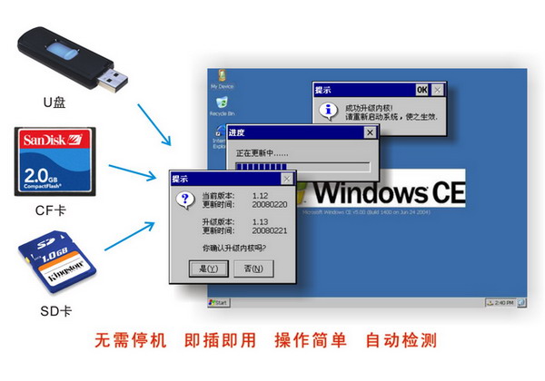 適用於WinCE 5.0操作係統,自定義升級方式,在係統升級設計,使用U盤/CF卡/SD卡實現升級,無需專用設備。