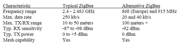 本文我們利用ZigBee作為對比的基礎。表1(如下)概括了ZigBee所有最關鍵的特征。這些特征具代表性,並且隨著具體供應商的不同而不同。而這都是你需要在無線鏈接中定義的要點。 要注意的是ZigBee實際上有3個版本。最普遍和廣泛使用的是工作在2.4GHz微波頻段以及Wi-Fi、藍牙和其它一些服務中的版本。即使大多數情況下它極少被使用,但它擁有最高的數據速率。其它版本工作在UHF頻段。歐洲采用868MHz頻段和20kbps的數據速率。而美國采用915MHz頻段。對於大多數應用來說,40kbps的數據速率已經足夠。低頻ZigBee版本最大的優勢就是他們通常可以覆蓋一個較大的範圍。