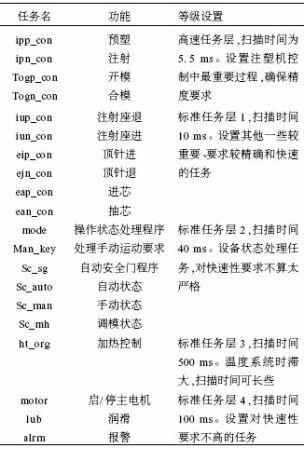 控製係統軟件主要由上位機和下位機軟件構成。上位機控製係統軟件需要實現顯示、通訊、數據存儲、配方的讀取和設置等功能,包括4大部分:程序模塊、係統模塊、數據模塊及麵板程序模塊。下位機軟件係統是整個注塑機軟件係統的主要部分,它是按注塑工藝流程編寫的應用程序。B&R PC 操作係統Automation Studio(AS) 是一個分時多任務操作係統,采用分時多任務機製構築其應用軟件的運行平台。它可以把任務分成數個具有不同優先權的等級,其中優先權高的任務等級有著較短的循環掃描時間,而且每個任務等級可包括多個具體任務,在這些任務中間可再細分其優先權的高低。在AS 操作係統管理下,優先權高的任務總是先被執行,剩餘的時間再執行優先權較低的任務。因此,在軟件設計中可以按應用程序的重要程度進行任務設置,從而使控製係統得到優化,具有較好的實時性。主要功能任務設置如表2 所示。