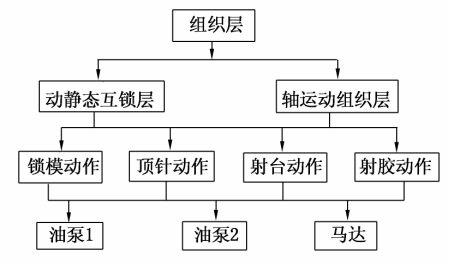 第1 層為組織層(主程序mode) ,進行注塑機動作狀態的判斷和處理;第2 層為注塑機各個狀態(全自動、半自動、手動、設置、調模狀態) 的運動組織和安全判斷的互鎖操作(動態互鎖和靜態互鎖);第3 層為各個動作或功能,它由第2 層進行組合調用;第4 層是指係統的壓力流量控製任務。