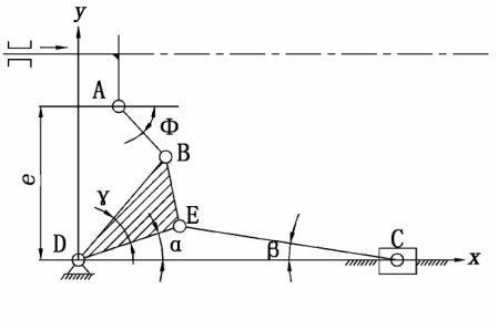 開合模運動控製的對象是動模板C ,而動模板是由油缸通過雙曲肘機構驅動的,因此,需要建立油缸活塞位置與動模板位置的相互關係,以及油缸活塞在某一位置時活塞運動速度(由液壓係統開合模油缸流量決定) 與動模板運動速度的相互關係,即進行合模機構的線性化工作。