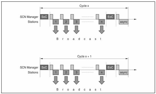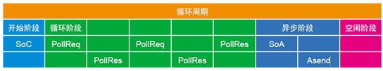 一個POWERLINK循環包括一個循環頭(SoC),tabeikongzhiqiyongyutongbucaozuo,xunhuantouzhihou,guanliqixiangdiyigezhandianfasongyigechuansongqingqiu,xiangyingdetahuishoudaoyigechuansonghuiying。yicileitui。zaimeiyigexunhuanzhong,suoyoudezhandiandouhuibeifangwendao。xunhuantongxunzaiyigexunhuanwei(EoC)終止。而後就是非同步通信時間,這時,管理器就向某個站點發送或者提示其發送數據。