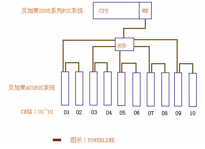 刷機的網絡結構為例,說明無軸凹版印刷機的POWERLINK網絡結構,以及站點分配的情況。在POWERLINK網絡結構中,貝加萊2005係列PCC的CPU模塊是中央數據處理單元,其插槽中的通信模塊的站點撥碼為00(MN),各伺服控製器站號依次為01到10(CN)。網絡結構如下圖示:圖3