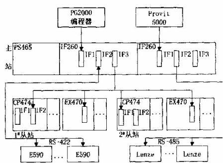 圖1 為PCC控製4 台擠出機係統框圖。4 台擠出機都是單螺杆擠出機:內管擠出機螺杆主電機為75kW直流電機;內管塗膠擠出機螺杆主電機為55kW直流電機;外管塗膠擠出機螺杆主電機為55kW直流電機;外管擠出機主電機為45kW直流電機。4 台擠出機的螺杆直流電機都是由數字式直流調速係統E590 驅動,它們通過主站處理器模塊的IF2 口以RS - 422 與PCC通信。牽引機主電機是三相交流電機,均由Lenze 變頻器驅動,它們通過主站接口模塊的IF2 口以RS - 485方式與PCC 通信。上位機為貝加萊公司的PROVIT -5000 係列工控機,用於在人機界麵上對全線設備集中監控。擠出機的控製選用PCC2005 作為主站, 兩台PCC2003 作為從站,包括電源模塊PS465 、處理器模塊、接口模塊、溫度輸入模塊、模擬量輸入模塊、模擬量輸出模塊、數字量輸入模塊和數字量輸出模塊。工控機、主站和兩個從站通過CAN 現場總線實現實時通信。