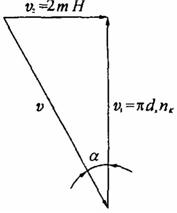又由於卷繞速度v(其單位為m/min)與卷裝表麵圓周速度v1、橫動導絲速度v2之間可構成一個如圖l 所示的卷繞速度矢量圖(圖中的a 為卷繞角、m 為導絲機構每分鍾往複次數),於是對應於tx的錠軸轉速nK (其單位為r/min)的某一值為: