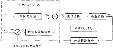 為了實施上述錠軸傳動的特殊轉速規律,可采用結構框圖如圖2 所示的機電一體化控製方案。錠軸傳動的執行機構所接受的指令為錠軸轉速實際給出值n :它是以函數關係式(4)所確定的錠軸轉速計算值n 作為主要內容;同時,考慮到隨著卷裝外徑的不斷增大,卷取機構的慣性、卷裝旋轉時產生的風阻和摩擦力矩亦隨之增大,考慮到接觸輥打滑的影響,則將接觸輥實際轉速n 與對應v的接觸輥設定轉速n 進行比較,把兩者之間的本次偏差e 通過自動可變比例增益的比例積分(PI)控製算法,對式(4)的計算值n 進(jin)行(xing)輔(fu)助(zhu)的(de)微(wei)量(liang)修(xiu)正(zheng),以(yi)進(jin)一(yi)步(bu)改(gai)善(shan)控(kong)製(zhi)過(guo)程(cheng)的(de)靜(jing)動(dong)態(tai)特(te)性(xing)和(he)保(bao)證(zheng)高(gao)速(su)卷(juan)繞(rao)機(ji)的(de)恒(heng)線(xian)速(su)卷(juan)繞(rao)。所(suo)以(yi),錠(ding)軸(zhou)轉(zhuan)速(su)實(shi)時(shi)控(kong)製(zhi)時(shi)的(de)實(shi)際(ji)給(gei)出(chu)值(zhi)為(wei): (5 )
