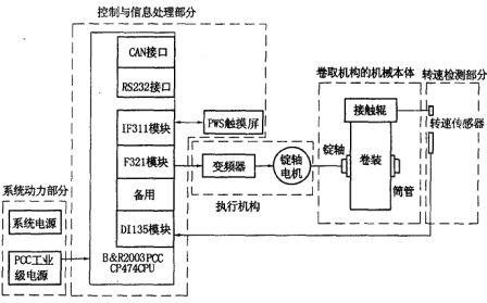 在具體實現式(5)所要求的檢測、計算和控製任務時,可應用PCC 控製技術按圖2 的示意設計成為如圖3 所示的一種錠軸傳動卷繞機機電一體化的PCC 控製係統:zhizhitongguanshangraoyoujuanzhuang,juanzhuangshangyoushijiayidingjiechuyalidejiechugun,jiechugundeshijizhuansuyouqiduiyingdezhuansuchuanganqijianceshiqu,zhuangyouzhizhitongguandedingzhouyoudingzhoudianjizhijiechuandong,dingzhoudianjitongguoqibianpinqitiaosu,zhenggexitongdehexinbujianshiPCC 。圖3 中的PCC 選用了奧地利貝加萊工業自動化公司B&R2000PCC 係列B&R2003PCC 及其模塊化擴展技術,它主要由B&R2003PCC 子係列中的CP474CPU 主模塊、DI135 高速數字量輸人模塊、IF321RS485 接口模塊和IF3llRS232 接口模塊等組成。