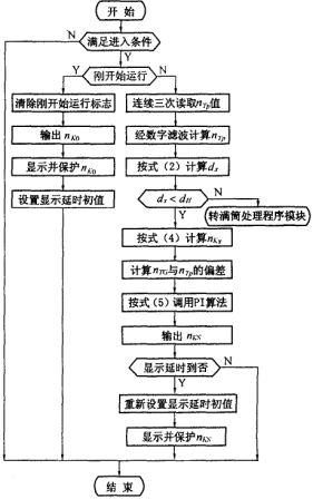 圖5 所示的為過程控製處理程序流程圖,它是以函數關係式(4)為主要參照物,通過檢測拾取n 計算求出e ,按式(5)的PI 算法得出n ,經變頻器調速,使錠軸轉速按照式(4)的目標函數運行,直至到達卷裝滿筒外徑d 為止,從而實現對錠軸傳動電機的閉環實時控製。