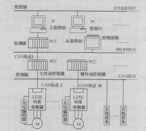 紙機傳動控製係統的組織級由上位工業控製計算機(IPC) 來實現, 完成整個傳動控製的數據處理以及控製決策, 它與B&R 2005 通過ETHERNET 以太網接口相連。分層遞階式控製係統的協調級由B&R 2005來實現, 它與另外的負責輔助傳動控製的B&R 2005通過PROFIBUS 相連, B&R 2005 的NW150 模塊提供標準的PROFIBUS 接口。變頻器、電機以及各種傳感器執行分層遞階式控製係統的控製級任務。變頻器通過CAN 總線掛接在控製網絡中。B&R 2005 的IF671協處理器提供1個 RS232 接口、1 個RS485/ 422 接口和1 個CAN 接口。利用CAN 接口, 變頻器通過CAN總線掛接在控製網絡中。