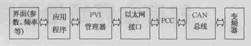 本程序的主監控界麵有4 個, 包括主傳動速度鏈控製界麵, 輔傳動控製界麵, 實時曲線界麵和報警記錄界麵。主傳動速度鏈控製界麵主要由17 個主傳動點的速度、電流、電壓等顯示部分和整個紙機的控製信號如爬行、運行等組成。在主傳動速度鏈控製界麵中,點擊各個傳動點, 進入各傳動點的數據顯示和操作區。這部分包括: ①張力值設定和頻率實際值顯示。②頻率值設定和頻率實際值顯示; 變頻器的參數部分包括:站點號、參數值設定和參數值讀取; 控製部分包括: 啟動、停止, 正轉、反轉, 單動、聯動, 改變、禁止等。要改變變頻器參數時必須先按“改變”控製按鈕, 應用程序才允許用戶改變參數。若不想隨便改變參數和頻率, 按下“禁止”按鈕即可封鎖所有針對參數的操作。如果應用程序在進入時設置密碼管理部分, 可實現監控和管理的安全。輔傳動控製界麵基本上和主傳動控製界麵相似。實時曲線界麵是各種實時曲線, 可以通過這些曲線監視係統的穩定性。報警記錄界麵主要記錄和顯示各種報警事件, 並顯示相應的原因, 給檢修提供依據。上位工控機和下位B&R 2005 的數據交換通過PVI 接口, 其數據傳輸過程如圖5 所示。