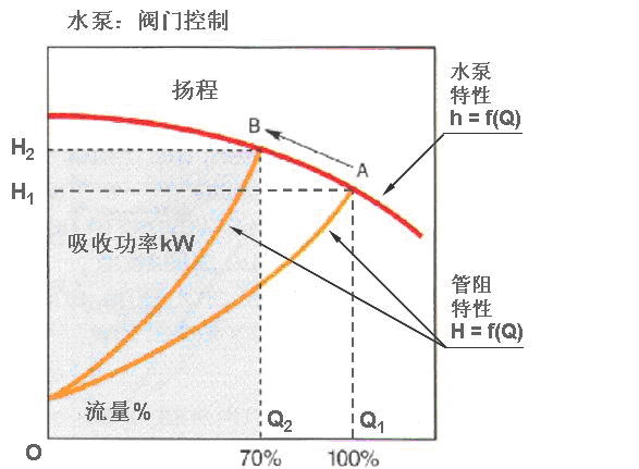 節能降耗、增加效益是全社會應為之努力的方向。我國的電動機用電量占全國發電量的60%~70%,風機、水泵設備年耗電量占全國電力消耗的1/3。應用於風機、水泵等設備的傳統方法是通過調節出口或入口的擋板、閥門開度來控製給風量和給水量,其輸出功率大量消耗在擋板、閥門地截流過程中。另外,由於在通常的設計中為了滿足峰值需求,水泵選型的裕量往往過大,也造成了不應有的浪費。根據風機、水泵類的轉矩特性,采用變頻調速器來調節流量、風量,將大大節約電能。下麵就分析一下在風機水泵類負載中使用變頻器所能達到的效果。 一,通過變頻調速達到的一次節能。 下麵以水泵為例來說明,由圖1可以看到: 8226; 流量Q正比於轉速n 8226; 壓力H正比於n2 8226; 轉矩T正比於n2 8226; 功率P正比於n3