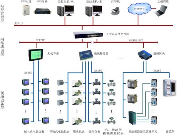 Acrel-5000能耗監測係統以計算機、通訊設備、測控單元為基本工具,為大型公共建築的實時數據采集、開關狀態監測及遠程管理與控製提供了基礎平台,它可以和檢測、控製設備構成任意複雜的監控係統。該係統主要采用分層分布式計算機網絡結構,如圖1所示:站控管理層、網絡通訊層和現場設備層。