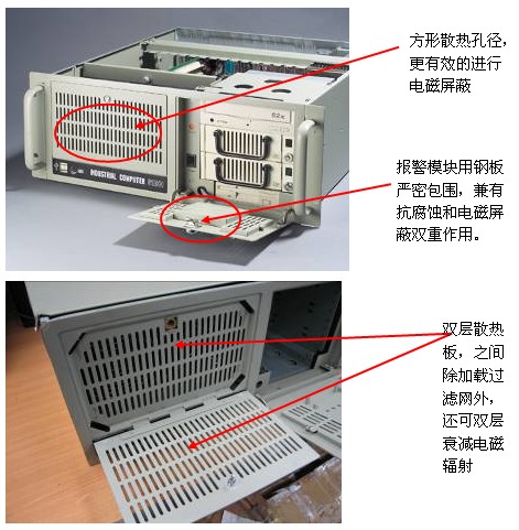 商用PC的散熱孔設計 但dan實shi際ji上shang防fang止zhi電dian磁ci泄xie漏lou的de設she計ji標biao準zhun對dui散san熱re孔kong徑jing的de大da小xiao,以yi及ji形xing狀zhuang是shi有you諸zhu多duo限xian製zhi的de,研yan究jiu實shi驗yan表biao明ming,方fang形xing孔kong徑jing要yao比bi圓yuan形xing孔kong徑jing具ju有you更geng出chu色se的de防fang止zhi電dian磁ci泄xie漏lou效xiao果guo。商shang用yongPC為何多采用圓形孔徑,恐怕隻有商用PC廠商明白吧。 下麵我們再來看看工控機的散熱孔的設計。還是以經典機型IPC-610H為例: