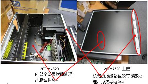 3、機箱表麵的特殊設計 商用PCjixiangcailiaoduocaiyongduxingangban,bingkaolvxishoujixiangneifushedeyouxiaoxing,zaijixiangneibumeiyoujinxingpenqichuli,yincijixiangneibideduxingangbanshikeyidaodiande,yegengrongyixishoudiancifushe,zheyeshideshangyongPC機在靜電防護、電磁屏蔽方麵有著先天的優勢。商用PC的這種機箱在普通使用下沒有問題,但是如果用於工控環境則是十分不合適的。 首先、工控機在某些時候要用在有強烈腐蝕性的環境下,例如海上的海鹽、高速公路上排出的汽車尾氣、化(hua)工(gong)廠(chang)的(de)氣(qi)體(ti)都(dou)具(ju)有(you)強(qiang)烈(lie)的(de)腐(fu)蝕(shi)性(xing)。因(yin)此(ci)機(ji)箱(xiang)內(nei)外(wai)表(biao)麵(mian)都(dou)必(bi)須(xu)要(yao)做(zuo)抗(kang)腐(fu)蝕(shi)處(chu)理(li)。下(xia)圖(tu)為(wei)研(yan)華(hua)工(gong)控(kong)機(ji)在(zai)機(ji)箱(xiang)外(wai)表(biao)麵(mian)和(he)機(ji)箱(xiang)內(nei)壁(bi)進(jin)行(xing)防(fang)腐(fu)蝕(shi)烤(kao)漆(qi)處(chu)理(li)後(hou)的(de)機(ji)箱(xiang)。 其次、有you時shi計ji算suan機ji會hui在zai振zhen動dong的de環huan境jing下xia工gong作zuo,在zai某mou些xie特te殊shu的de情qing況kuang下xia,振zhen動dong會hui導dao致zhi機ji箱xiang內nei的de某mou些xie電dian器qi元yuan件jian接jie觸chu到dao機ji箱xiang內nei部bu表biao麵mian,由you於yu機ji箱xiang內nei壁bi導dao電dian,所suo以yi很hen容rong易yi造zao成cheng短duan路lu,燒shao毀hui設she備bei。 而工控機在內部的噴漆處理使得機箱內壁不導電,可以杜絕這類現象的發生。但是正所謂成也蕭何、敗也蕭何,正是因為這些不導電的機箱內壁對工控機的EMC設計有著更高的挑戰。工控機由於內壁也進行了烤漆處理,因此機箱表麵不導電,無法象商用PC一樣形成等地體,因此隻得在部分位置處留出沒有噴漆的接觸麵,形成導電體,在整個機箱表麵形成等勢體,處理工藝較為複雜。 還是讓我們來看看工控機箱內部噴漆的設計把,以今年INCG新推出的新ACP-4320為例把黑色機箱看的更清楚。:)