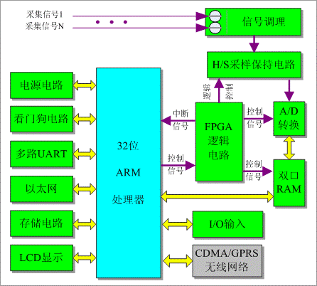恒頤高速同步數據采集係統主要包括以下幾個部分:ARM控製器、存儲電路、FPGA邏輯控製電路、A/D轉換電路、FIFO緩存、電源電路、接口電路等。 係統具備多通道數據采集接口,FPGA邏輯電路控製A/D采集和FIFO緩存模塊,實現長時間不間斷的數據采集與數據轉換;同時係統具有豐富的外圍控製接口和通信接口,可以實現數據的存儲、顯示,完成RS485/RS232或高速以太網絡的數據傳輸。 係統硬件結構如圖所示: |