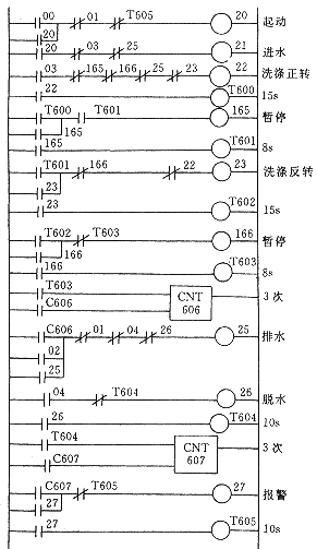 圖5洗衣機工藝流程圖 第二步選擇PC機型,設置I/O點編號。其I/O點編號分配如下: I/O點分配 計時/計數器分配 00起動開關 T600正轉計時 01停止開關 T601暫停計時 02手動排水開關 T602反轉計時 03高水位開關 T603暫停計時 04低水位開關 T604脫水計時 20起動洗衣機 T605報警計時 21進水 C606洗滌次數 22正轉洗滌 C607脫水次數 23反轉洗滌 25排水 26脫水 27停止、報警 第三步,根據流程圖,設計梯形圖,如圖6所示