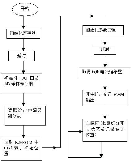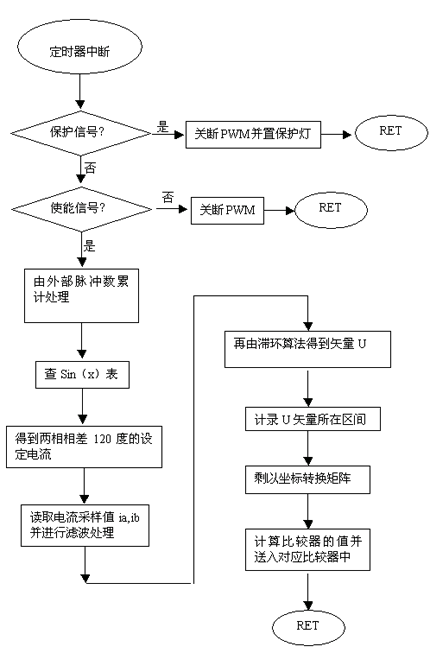 圖3 驅動器的整體框圖 3.1 DSP模塊設計 在這裏,我們選擇了TI公司的DSP作為CPU芯片,DSP(Digital Signal Processor)實際上也是一種單片機,它同樣是將中央處理單元、控控製單元和外圍設備集成到一塊芯片上。但它又有自身鮮明的特點――因為采用了多組總線技術實現並行運行的機機製,從而大大提高了運算速度,具有更強的運算能力和更好的實時性。本文選用的DSP(TMS320LF2407A)是一款電機控製專用芯片,144引腳,具有豐富的IO資源,含有四個通用定時器,具有兩路專用於控製三相電機的PWM發生器(可產生六路PWM信號),另外還有專用接收外部脈衝和方向的I/O口,從而簡化了電路設計和程序開發。 DSP輸入信號包括步進脈衝信號CP、方向控製信號、脫機信號, 過流保護信號。這幾種信號均通過高速光耦連接到DSP的引腳上,另外還有細分步數及電流選擇信號。當脫機信號為有效時,驅動器輸出到電機的電流被切斷,電機轉子處於自由狀態(脫機狀態)。反饋電流通過DSP自帶的的10 位模數轉換器(AD)采樣,反饋的電流通過一定的算法後,由DSP自帶的PWM口輸出控製電機。 3.2 電流追蹤型回路 這種傳輸方式以模擬電壓的幅值代表采樣電流或者電壓的大小,其主要用來采樣a,b兩相電流及母線電壓檢測,實現電機電流控製以及過壓、欠壓、過流保護。驅動器通過采樣電阻檢測步進電機繞組的實際電流,與設定電流相比較後經過滯環比較器調節器,調節器輸出信號由20KHz 頻率的三角波載波輸出,形成脈寬調製信號(PWM),通(tong)過(guo)功(gong)率(lv)驅(qu)動(dong)接(jie)口(kou)電(dian)路(lu)來(lai)控(kong)製(zhi)大(da)功(gong)率(lv)半(ban)導(dao)體(ti)器(qi)件(jian)的(de)導(dao)通(tong)與(yu)關(guan)斷(duan),使(shi)步(bu)進(jin)電(dian)機(ji)的(de)繞(rao)組(zu)實(shi)際(ji)電(dian)流(liu)跟(gen)蹤(zong)給(gei)定(ding)參(can)考(kao)信(xin)號(hao),按(an)給(gei)定(ding)的(de)正(zheng)弦(xian)規(gui)律(lv)變(bian)化(hua)。 3.3 功率驅動電路 驅動器的主回路采用交-直-交電壓型逆變器形式,由整流濾波電路、三相逆變器以及步進電機等組成。整流濾波電路構成直流電壓源,完成220V、50Hz 交jiao流liu電dian源yuan到dao直zhi流liu電dian源yuan的de變bian換huan。逆ni變bian器qi實shi現xian從cong直zhi流liu電dian到dao變bian頻pin變bian壓ya交jiao流liu電dian的de轉zhuan換huan,為wei三san相xiang混hun合he式shi步bu進jin電dian機ji的de定ding子zi繞rao組zu提ti供gong要yao求qiu的de交jiao流liu電dian流liu。逆ni變bian器qi由you仙xian童tong公gong司si生sheng產chan的de六liu隻zhiG30N60B3DMOS管組成,構成三相逆變橋。驅動器采用兩隻電阻檢測步進電機相電流的瞬時值。 功率驅動電路的核心是功率模塊(MOS管)。MOS管 與電流追蹤型PWM 輸出之間必須通過專用高速光耦連接。根據MOS管的過流值和電機峰值線電流來選用合適的MOS管,即電機的線電流的峰值小於MOS管的最大電流值。本設計中電機最大相電流為8.1A,該電流是相電流的有效值,峰值相電流為8.1* sqrt(2) = 11.312A 。此外,電機繞組在三角形接法時,線電流是相電流的3 倍,所以線電流峰值為19.6A。由G30N60B3DPDF文檔知,其最大流值為30A,故可以保證正常使用,正常工作要求適當的散熱設計保證內部結溫永遠小於150攝氏度,因此要外加散熱器並強製風冷,以保證MOS管正常工作。 3.4並口通訊: 為了避免在控製過程中停電或者其它特別原因掉電時造成損失,使用帶電RAM存儲電機位置,保證來電後工件可繼續完成加工。並口RAM比傳統使用的E2ROM速度傳輸更快更可靠,可更有效的記錄電機運行狀態,但占用CPU的I/O口較多,這裏CPU有足夠的資源可以使用。 3.5 控製軟件流程 主程序流程圖
