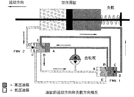 雙向齒輪泵通過兩個流量配對閥(FMV1和FMV2)中的一個來使雙作用缸的任一側增壓,為把活塞移動到左邊,通過A端口使FMV2加壓,閥芯在壓差作用下左移打開逆止閥,液壓油可從端口D流到B,從端口A流到E,在從D流出的油壓作用下活塞向左移動。需要說明的是在圖示活塞的運行方向和負載方向相反的情況下,由於B、C端口的壓力很低,幾乎為大氣壓力,此時FMV2還起到節流閥的作用使Dqiangbaochishidangdebeiya,congerbaozhengxitongyunxingpingwen。dangyougangshuchudaodazhidingweizhishibengtingzhigongzuo,lianggenizhifajunguanbi,yeyayouliuzaigangnei,madabuxuyaocaozuojiukeyishiyeyagangdeweizhideyibaochi。
