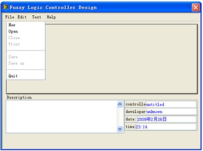 創建一個.fc文件步驟如下:打開一個新的VI,在任務欄依次點擊Tools――Control Design and Simulation――Fuzzy Logic Controller Design…,接著在彈出的 Fuzzy Logic Controller Design對話框的狀態欄上點擊File――New,即打開了一個新的.fc文件(圖4)。