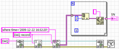 仍以DB Tools Select Data.vi為例,該VI已經將SELECT語句預先集成好,我們隻要在optional clause接線端寫入WHERE語句,寫上判斷條件即可。WHERE語句作為判斷語句,可以支持很多運算符寫入各種條件隨意讀取數據庫: 比較運算符(大小比較):>、>=、=、<、<=、<>、!>、!<; 範圍運算符(表達式值是否在指定的範圍):BETWEEN…AND… NOT BETWEEN…AND…; 列表運算符(判斷表達式是否為列表中的指定項):IN(項1,項2……) NOT IN(項1,項2……); 模式匹配符(判斷值是否不指定的字符通配格式相符):LIKE、NOT LIKE; 空值判斷符(判斷表達式是否為空):IS NULL、NOT IS NULL; 邏輯運算符(用亍多條件的邏輯連接):NOT、AND、OR; 比如我們要將時間在“2026-04-07 15:51:40”測試的所有產品的SN號都讀出來,可以這樣編寫程序,見下圖(圖1):