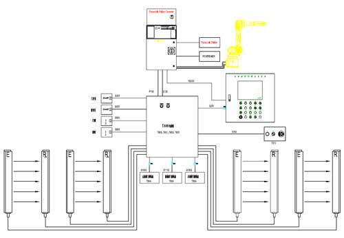 整個工作站的控製都是由機器人控製箱來完成,利用了FANUC獨有的PMC功能來實現邏輯運算,起到PLC的作用而不使用硬件PLC,大大降低的係統成本。此外,FANUC R-30iA控製櫃可以直接和觸摸屏HMI相聯接配合使用,可以直接訪問到機器人控製櫃裏的數據,比如寄存器、位置寄存器、I/O、甚至機器人的錯誤信息都可以實時的顯示在觸摸屏上。這樣,可以讓操作工在觸摸屏上讀取信息,而不通過示教器。