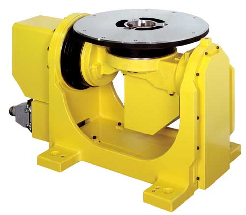外軸回轉台采用FANUC標準的2軸變位機,其負載能力為500kg,足以滿足叉車後橋、油箱的焊接需求。變位機的回轉翻轉完全由機器人來控製,在焊接時可以和機器人來協調焊接,保證焊接質量。