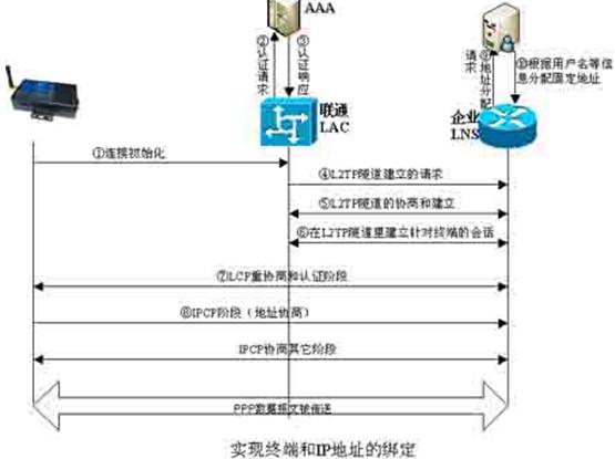 根據L2TP信令流程,在終端通過認證後將進行IPCP的協商。我們控製了IPCP協商階段,使其能針對終端分配不同固定IP地址,其原理圖如下: