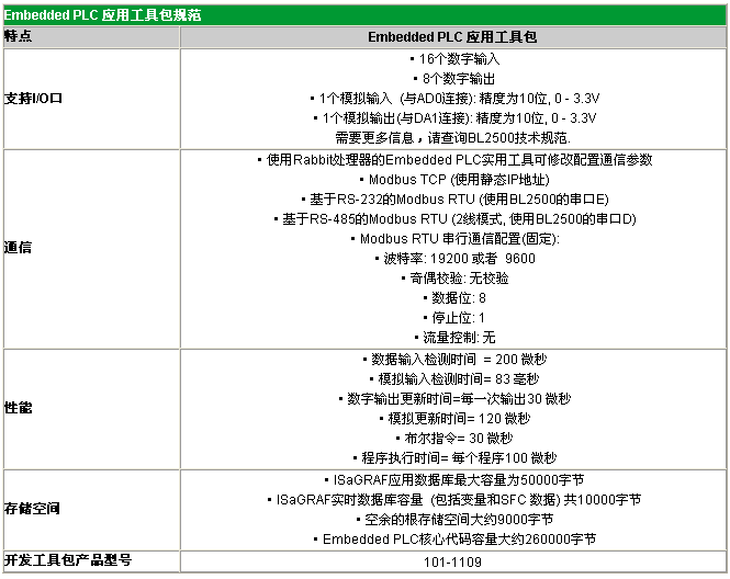 Embedded PLC應用開發包可應用在Rabbit 3000的單板機上,使用PLC(可編程邏輯控製)編程通用的標準軟件環境。自動化控製應用係統設計者現在能夠從Rabbit獲得更多高性價比的硬件解決方案,並且軟件開發與國際標準IEC61131-3兼容。 自動化控製係統像工廠裝配生產線,一般都使用工業編程語言,例如:順序功能圖(SFC),功能塊圖(FBD),梯形圖(LD),結構文本(ST)和指令列表(IL)。Embedded PLC應用開發包支持IEC61131-3標準中包含的所有這些語言,另外還支持其他工業語言流程圖(FC)。開發包還包括ISaGRAF V3.50版本(含32個I/O包),它支持Rabbit硬件平台的移植。 Embedded PLC應用開發包為您提供所有需要的工具,這樣您可以在Rabbit Semiconductor SBC上使用ISaGRAF PLC編程係統。在該開發包中還包括BL2500,帶flash存儲器,SRAM,數字I/O口,模擬I/O,RS-232/RS-485串口以及10/100baseT以太網口的高級單板機。BL2500單板機為自動化控製工程師提供功能強大,低成本的嵌入式解決方案,適用於像工業裝配控製,訪問控製,HVAC和自動售貨機等高級應用。BL2500僅僅100 x 100毫米的尺寸大小易於安裝在標準100毫米的DIN導軌中。外部連接是通過偏振滾動摩擦鎖相連接器以及線纜提供。 產品特色: ・ 支持32個I/O 的ISaGRAF V3.50平台 ・ 完整具備BL2500特性 ・ 內嵌BL2500 Embedded PLC內核 ・ 原裝線,連接器和終端 ・ 編程連接線和文檔 ISaGRAF V3.50支持以下工業可編程語言: ・ 順序功能圖(SFC) ・ 功能塊圖(FBD) ・ 梯形圖(LD) ・ 結構化文本(ST) ・ 指令表(IL) ・ 流程圖(FC) 應用 ・ 工業自動化 ・ 運動控製 ・ 進程控製 ・ 分布式控製係統 ・ 複雜網絡