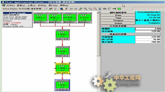 Proficy Plant Applications Client:通tong過guo客ke戶hu端duan工gong具ju展zhan現xian生sheng產chan現xian狀zhuang生sheng產chan狀zhuang況kuang的de監jian控kong與yu追zhui蹤zong。客ke戶hu端duan工gong具ju提ti供gong完wan整zheng的de多duo種zhong監jian視shi與yu應ying用yong分fen析xi畫hua麵mian模mo塊kuai,包bao括kuo報bao警jing,停ting線xian分fen析xi,譜pu係xi跟gen蹤zong,生sheng產chan事shi件jian等deng,開kai發fa過guo程cheng中zhong隻zhi需xu簡jian單dan調tiao用yong對dui應ying的de模mo塊kuai進jin行xing組zu態tai即ji可ke實shi現xian。如ru圖tu所suo示shi為wei生sheng產chan跟gen蹤zong畫hua麵mian,左zuo邊bian的de畫hua麵mian中zhong每mei一yi個ge模mo塊kuai代dai表biao某mou一yi生sheng產chan單dan元yuan上shang的de某mou一yi批pi次ci,不bu同tong批pi次ci之zhi間jian的de族zu譜pu關guan係xi的de通tong過guo帶dai箭jian頭tou的de曲qu線xian進jin行xing連lian接jie,形xing象xiang的de展zhan示shi了le批pi次ci流liu轉zhuan的de源yuan頭tou和he去qu向xiang;xuanzhongrenyipici,youbiandepicishengchanxinxihuamianzhongjiangzhanshigaipicishengchanjiliuzhuandejutixinxi,baokuopicihao,picizhixingdezhuangtai,kaishishijian,jieshushijian,liuzhuandeyuantouhemubiao,shengchanguochengcanshudengxiangguanxinxi。
