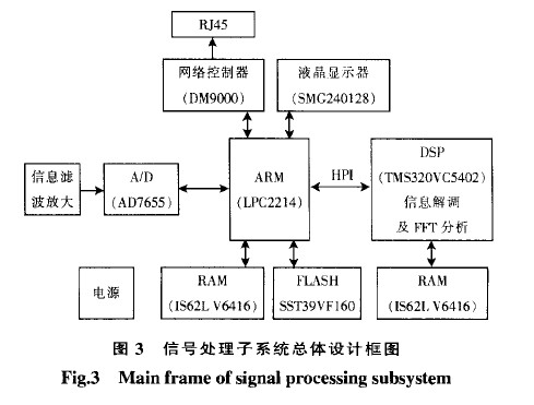 以ARM(選用飛利浦公司的LPC2214)和DSP(Ti公司的TMS320VC5402)為核心,外擴信號調理、A/D采集、網絡控製及液晶顯示模塊.以ARM作為係統控製中心,控製A/D轉換器進行地震加速度已調信號的采集,經DSP的HPI接口將數據存儲到DSP內部RAM 中.完成解調信號的網絡傳輸控製、實時顯示以及TMS320VC5402的HPI引導裝載.而DSP主要進行信號運算,完成解調和FFT頻譜分析.