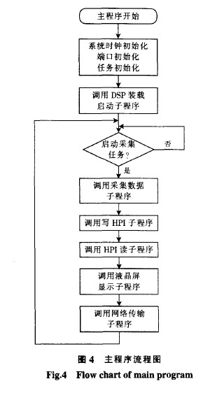 首先編寫好與硬件接口的驅動程序.應用層程序以任務為編程對象.任務具有任務堆棧、優先級等參數,根據任務的執行順序和重要程度可分配不同的優先級;在任務調度過程中可以通過OSTaskSuspend(os PRIO―SELF)、OSTaskResume(task_prio)函數進行任務之間的切換.本係統可分為DSP boot loader、 D采集、讀HPI、寫HPI、網絡傳輸、液晶顯示等6大任務.在主函數中創建任務,設置任務各項參數.主程序流程圖如圖4所示.