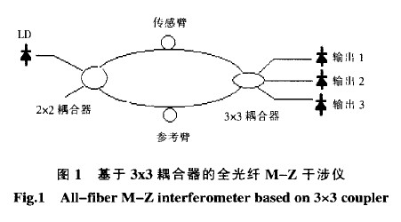地震加速度計由傳感探頭、光電轉換及信號處理係統構成.傳感探頭由采用基於3x3耦合的光纖M―z幹涉儀和相關機械部分組成.如圖1所示,幹涉儀的輸入端是一隻2x2耦合器,輸出端是一隻3x3耦合器,被測信號加在幹涉儀的傳感臂上.