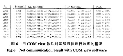 圖6所示為網絡數據包的傳輸情況.其中PC機的IP地址設置為192.168.0.4,本設計係統的IP地址設置為192.168.0.7,端口號為10000.實驗證明所設計的嵌入式信號處理係統可以實現基於TCP/IP的網絡通信.