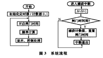 係統程序主要包括初始化定時器/計數器,捕獲中斷處理,頻率計算,顯示,開出控製等子程序,係統流程如圖3所示。
