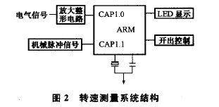在水輪機轉速測控係統中,為提高測量的可靠性,采用電氣(機端殘壓)信號和齒盤機械脈衝信號2種信號類型同時輸入的測量方式,計算得到的頻率值用於顯示,開出控製等。測量係統電路結構框圖如圖2所示。