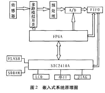 係統硬件主要分為ARM處理器模塊、協處理器FPGA模塊、預處理和A/D模塊、通用外設模塊4個部分,ARM處理器和現場可編程門陣列(FP.GA)gongtongzuchengjiankongxitongdehexinchulidanyuan。xianchangkantanjianceshi,keliyongbaozhadefangshizuoweijifazhenyuan,dangyicibaozhaqidonghou,chuanganqixinhaotongguomonikaiguan,xianjingguoqianzhifangdahelvbodengyuchuli,huoqufuheA/D轉換芯片要求的信號,經過A/D轉換,進入FIFO,然後由嵌入式微處理器讀取並處理數據,然後將數據存儲到SIM卡或USB存儲設備中。在A/D轉換模塊中,采用多路模擬開關,可完成大數量點的數據采集。FPGA是整個係統的控製中心,控製采集通道的切換,A/D轉換芯片的啟停,轉換後的數據在FIFO中的存放以及向主處理器$3C2410A產生中斷請求讀取FIFO中的數據。如圖2所示。