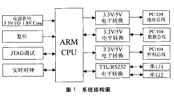 基於ARM的PC/104係統主要由處理器 、總線接口 、 Flash、實時時鍾 、複位電路 、通訊接口、調試接口、電源幾個部分組成 ,如圖 1所示。