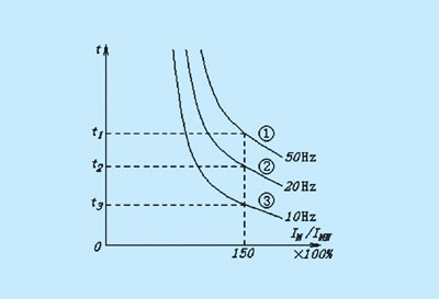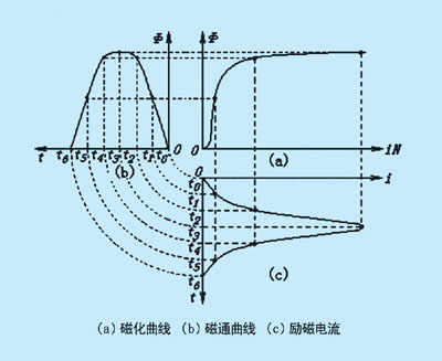 圖3(a)是電動機磁路的磁化曲線;圖3(b)是磁通的波形,由於磁路飽和的原因,磁通波形的上麵被“削平”了,變成了平頂波;圖3(c)是勵磁電流的波形,其橫坐標是勵磁電流i0,與磁化曲線圖3(a)的橫坐標對應。縱坐標是時間t,它和磁通曲線的橫坐標相對應。因此,它是由圖3(a)和圖3(b)綜合作出的。由圖3可以看出,勵磁電流i0的波形將發生嚴重畸變,是一個峰值很高的尖峰波。磁路越飽和,勵磁電流的畸變越嚴重,峰值也越大。 由於尖峰波的電流變化率di/dt很大,但電流的有效值不一定很大。結果是:往往在負載很輕時發生過電流跳閘。 這種由電動機磁路飽和引起的過電流跳閘,主要發生在低頻、輕載的情況下。常見的例子如: a) 負載在運行過程中,阻轉矩的變化較大。例如,某廠的車床采用變頻調速,所購變頻器無矢量控製功能。為了能在低速時進行切削,將U/f比預置得較大,但一退刀就跳閘。 解決方法:反複調整U/f比,使之既能在低速時進行切削,退刀時又不跳閘。 b) 變頻器用於風機或水泵,但U/f比卻預置得較大。例如,某廠有一台變頻器,原來用在傳輸帶上,運行情況一直很好。後改接到風機上,起動時,頻率剛上升到10Hz左右就因“過流”而跳閘了。這是因為,傳輸帶是恒轉矩負載,當變頻器用到傳輸帶上時,其U/f比(bi)必(bi)預(yu)置(zhi)得(de)較(jiao)大(da)。而(er)風(feng)機(ji)是(shi)二(er)次(ci)方(fang)律(lv)負(fu)載(zai),低(di)速(su)時(shi)負(fu)荷(he)級(ji)輕(qing),導(dao)致(zhi)電(dian)動(dong)機(ji)磁(ci)路(lu)嚴(yan)重(zhong)飽(bao)和(he),勵(li)磁(ci)電(dian)流(liu)嚴(yan)重(zhong)畸(ji)變(bian),峰(feng)值(zhi)很(hen)大(da),使(shi)變(bian)頻(pin)器(qi)跳(tiao)閘(zha)。 解決方法:將U/f比預置為最小檔後就不再跳閘了。